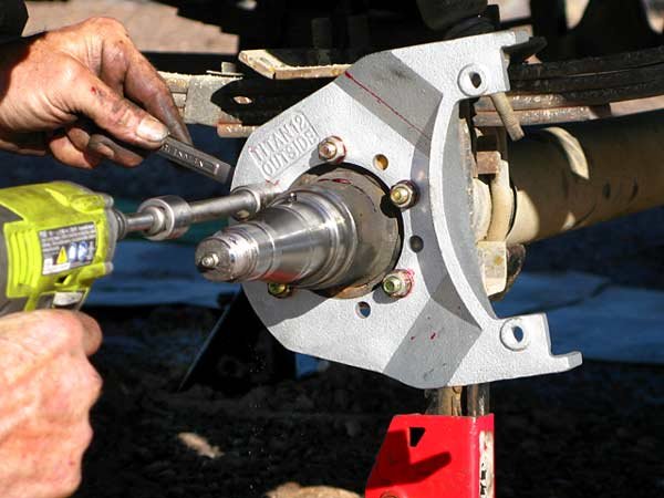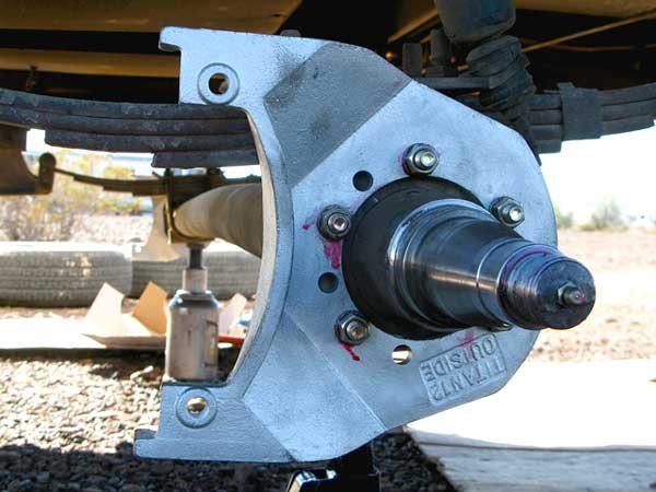Clip wires to the electric brakes, and remove the drums and backing plates off the axle spindles. Knock out the old bolts, as new Grade 8 bolts come with Titan kit. Do keep the hub washer, slotted nut, and cotter pin (or use new pin of same size). These are the only items not included because, although there are standard spindle sizes, these parts may have unique specifications depending on the axle manufacturer.