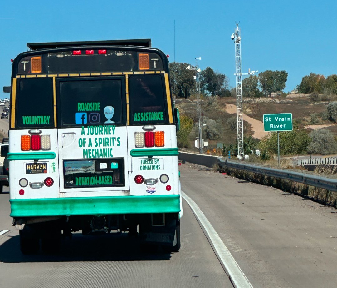 Way back in mid-September, we were enjoying the kind of beautiful fall day that made me want to stay in Fort Collins for good. OK maybe not for an entire winter. Regardless, we were on I-25 when an eye-catching skoolie passed us. It was “Journey of a Spirit’s Mechanic,” probably on the way to help someone stranded, or out of fuel, or trying to fix a flat tire.
